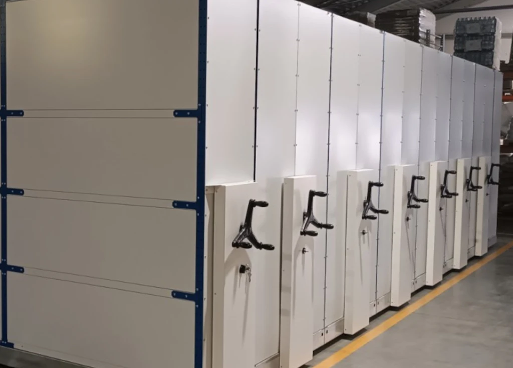 В составе промышленного стеллажа идут двери, полки полного выдвижения с несущей способностью до 200 кг и ящики. Мобильный вариант позволяет компактно хранить грузы в ящиках экономя до 50% складской площади.