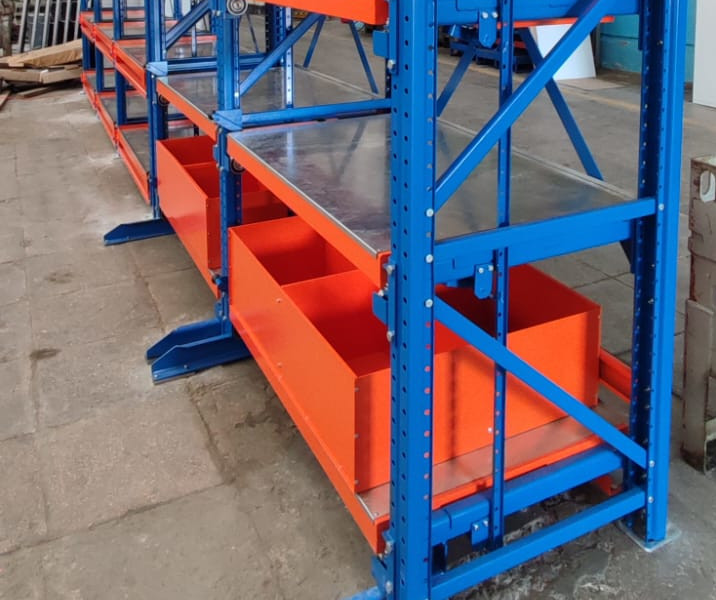 Металлические стеллажи с ящиками или контейнерами для склада или цеха используются для адресного и упорядоченного хранения как массивных инструментов, оснастки , так и мелких деталей. Могут быть разделены на ячейки с учётом веса и габаритов предметов.