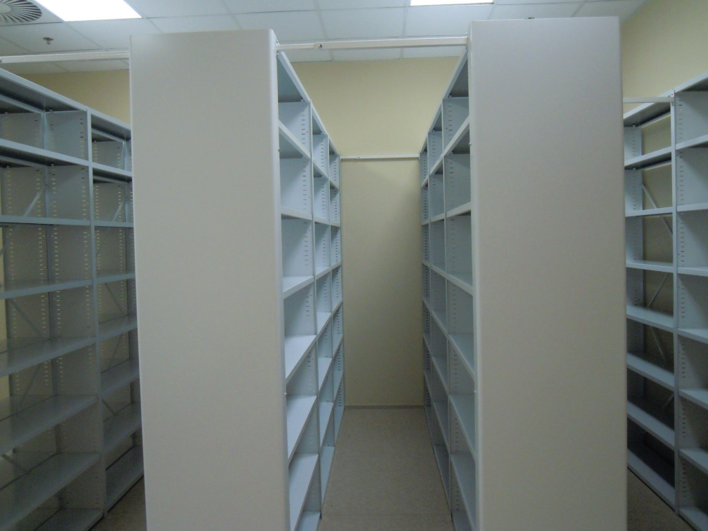 Системы компактного архивного хранения документов. Вдвое повышается вместимость или сокращаются занимаемые площади. Используются двухсторонние и односторонние передвижные стеллажи для архивохранилища.