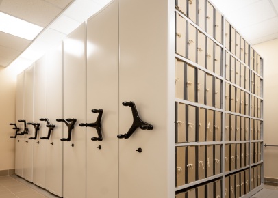 Системы компактного архивного хранения документов. Вдвое повышается вместимость или сокращаются занимаемые площади. Используются двухсторонние передвижные стеллажи для архивохранилища.