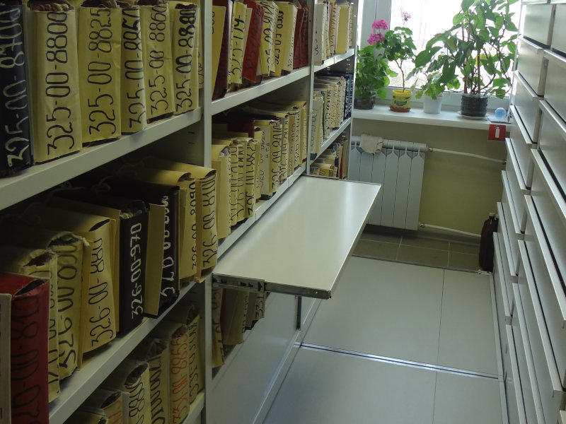 Короба с документами размещаются на металлических стеллажах. Они изготовлены под конкретные размеры коробов. Габариты полок и расстояние между ними оптимальны: обеспечены необходимые рабочие зазоры между коробами. Рабочие площади помещения используются эффективно.